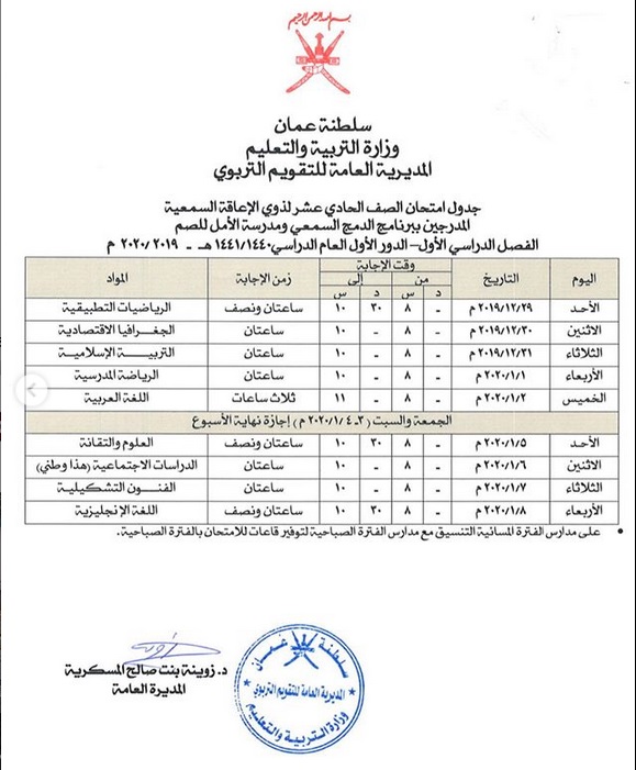 جدول امتحانات الفصل الاول سلطنة عمان 2019-2020 الدور الاول
